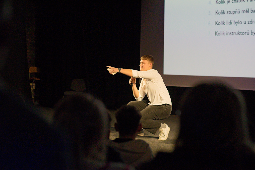 Hlavní program pak probíhal v kinosále. Po úvodním slovu pana ředitele následovala projekce třídních videoklipů. Promítání bylo proloženo dalšími záběry z adaptačního kurzu, krátkou prezentací školy a kvízem představujícím adaptační kurz v číslech.