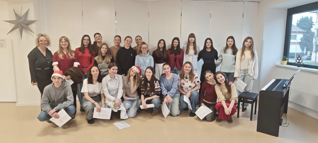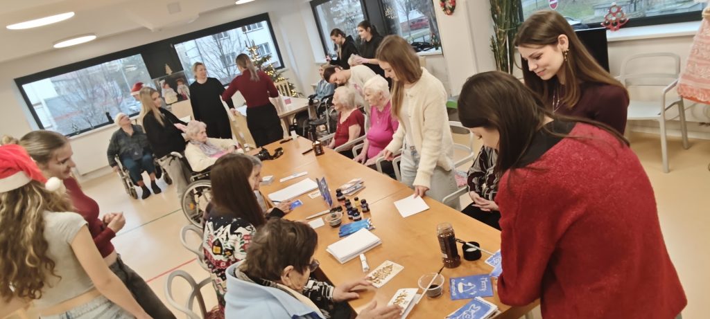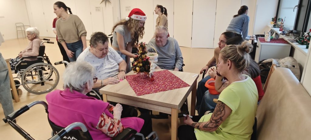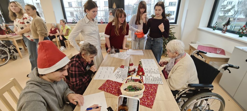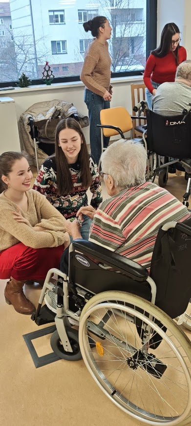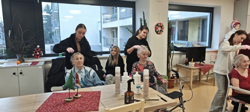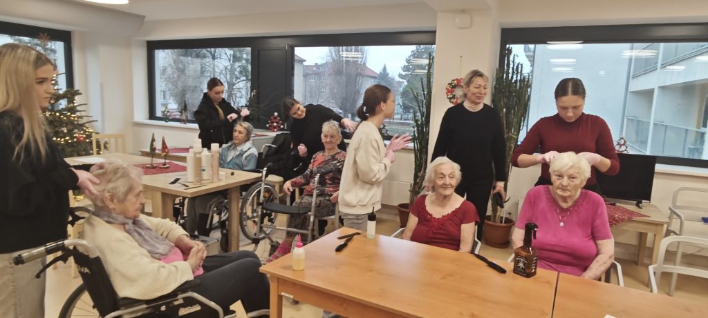 Ve společenské místnosti se středečního dopoledne 17. prosince 2025 připravovalo aktivní umělecké vystoupení. Účinkující všech specializací druhého ročníku oboru Pedagogického lycea připravili pro klienty domova seniorů příjemně strávené dopoledne. Zvláštností celého programu byla kreativní účast žákyň druhého ročníku oboru Kadeřník, které pod vedením paní Dany Kadlecové nabídly dámám úpravu účesů, tupírování, masáž hlavy, lakování.